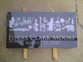 I have worked on some crazy art projects for clients, family and friends. Some of them would make you laugh…this one might make you cry. The most difficult piece of art that I have ever (and hopefully will ever) had to work on is the headstone for my son’s gravesite. If you have read my other posts you know the story of our son Lukas, so I am not going to get into the details. If you want to know the full story check out the Lukas Clark Moore post. It has taken us a long time to get this memorial done and we finally have a picture from the stone maker. I can’t wait for it to be set at the gravesite so we have something to visit.