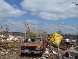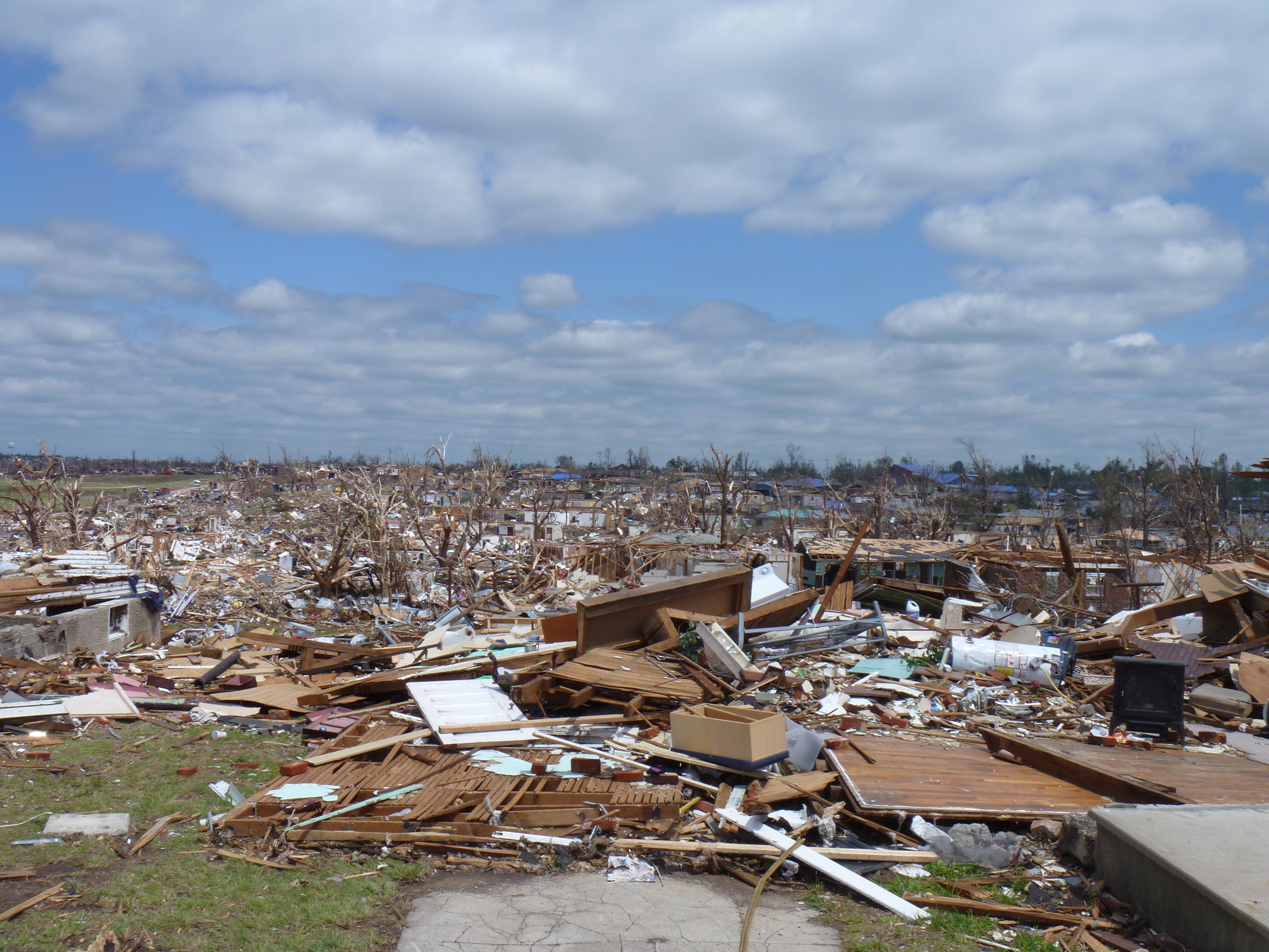 We talked to people who rode out the storm in their basements, closets and even one couple that rode things out in the crawl space under their home…that was all that was left of their home. I saw boards impaling cars, buildings, chimneys, pretty much anything that was able to withstand the force of the wind was riddled with shrapnel from homes and cars. I did not see one leaf all day. The trees were completely cleaned of all branches smaller than 4-5 inches in diameter or were uprooted all together. Pretty much take everything you learned in physics classes and just imagine the most extreme circumstances. Amazing force of nature.