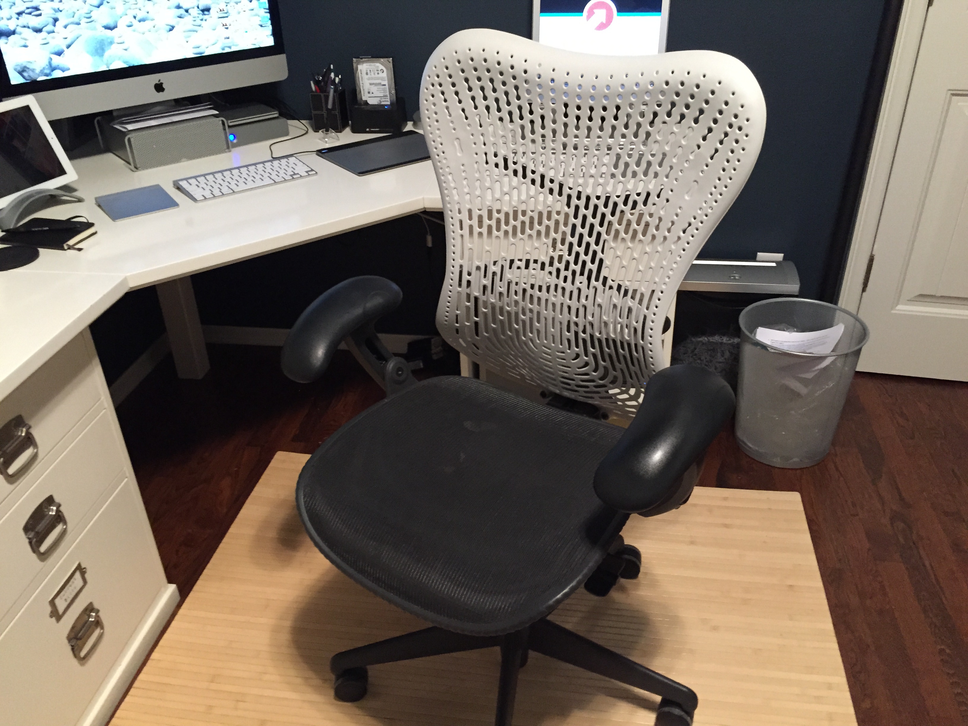 Invest in Your Chair. Your backside will be spending a LOT of time in this location and you need to be willing to buy a great chair to make it easy for you to spend the time you need sitting and doing your job, or it will become an excuse to stay on the couch. I have a Herman Miller Mirra chair and it is great for a room that often gets warm and it stands up to the hours of sitting a home office chair needs. My recommendation is try out a lot, read reviews and don’t balk if the one you love is expensive. This is not an area to compromise!